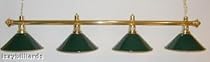 Quantity of 4 - 15" green metal shades 72" Brass finish metal lamp rod Mounting hardware and instructions included Adjustable chain for prefered hanging distance from ceiling Recommended for 9 foot pool tables Uses 4 60 watt bulbs ( bulbs not included ) UL listed Can install hard wired or plug in with adaptor ( adaptor not included ) A liscensed electrician is recommended for installation Assembly instructions included Due to rod size UPS charges oversized weight