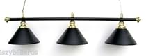 61" Pool Table Light Quantity of 3 - 15" black metal shades 61" brass finish / black metal lamp rod Mounting hardware and instructions included Adjustable chain for prefered hanging distance from ceiling Recommended for 7 or 8 foot pool tables Uses 3 60 watt bulbs ( bulbs not included ) UL listed Can install hard wired or plug in with adaptor ( adaptor not included ) A liscensed electrician is recommended for installation Assembly instructions included Please note shipping is high due to oversized UPS charges