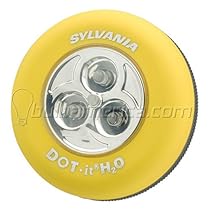 Sylvania Yellow Compact Size Waterproof Dot-It LED Light Push On Push Off Utilizes 3 White LED Lamps For Bright Light 3 "AAA" Batteries Included Alkaline Batteries Last 100 Hours LED Lamp Life 30000 Hours Special 3M Adhesive Adheres To Virtually All Surfaces & Allows Item To Be Restock 100 Times.