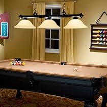 The Jarvis Pool Table/Island Light does more than just add some light; it adds a warm glow to any pool table or kitchen island. Three yellow-gold shades hang from the tastefully decorative bronze frame. The simple design of this hand-crafted light is ornamented by decorative end caps. At 56 inches wide this light fixture will provide adequate light for an 8-foot pool table or island.Dimensions: 56W x 15H x 16D inches. Includes 12 feet of cord and 6 feet of chain. Requires three 150-watt standard-base bulbs (not included). UL-listed.Note: Every Z-Lite item is a unique handcrafted work of art. Natural variation in the glass and finish make each and every one a masterpiece all its own. Photographs are a general representation of the product. Colors may vary slightly from picture.[]